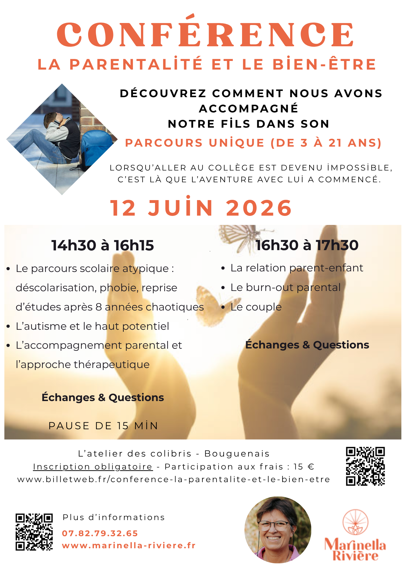- 14h30-16h15 : sa scolarité atypique (classique, déscolarisation, scolarité mixte puis rescolarisation), l’autisme, les accompagnements parentaux et l’approche thérapeutique