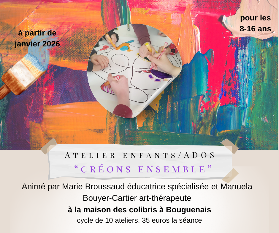 | Vendredi 9 janvier | 17h15 – 18h15 | Atelier enfants/ados : « Créons ensemble » | Marie Broussaud et Manuela Bouhier-Cartier |